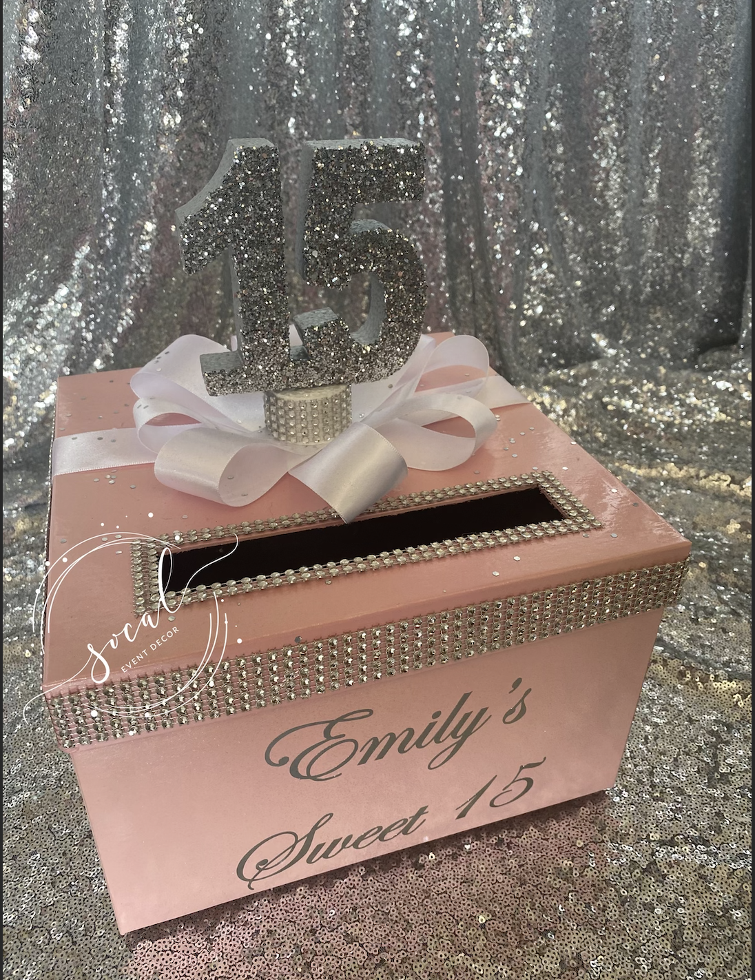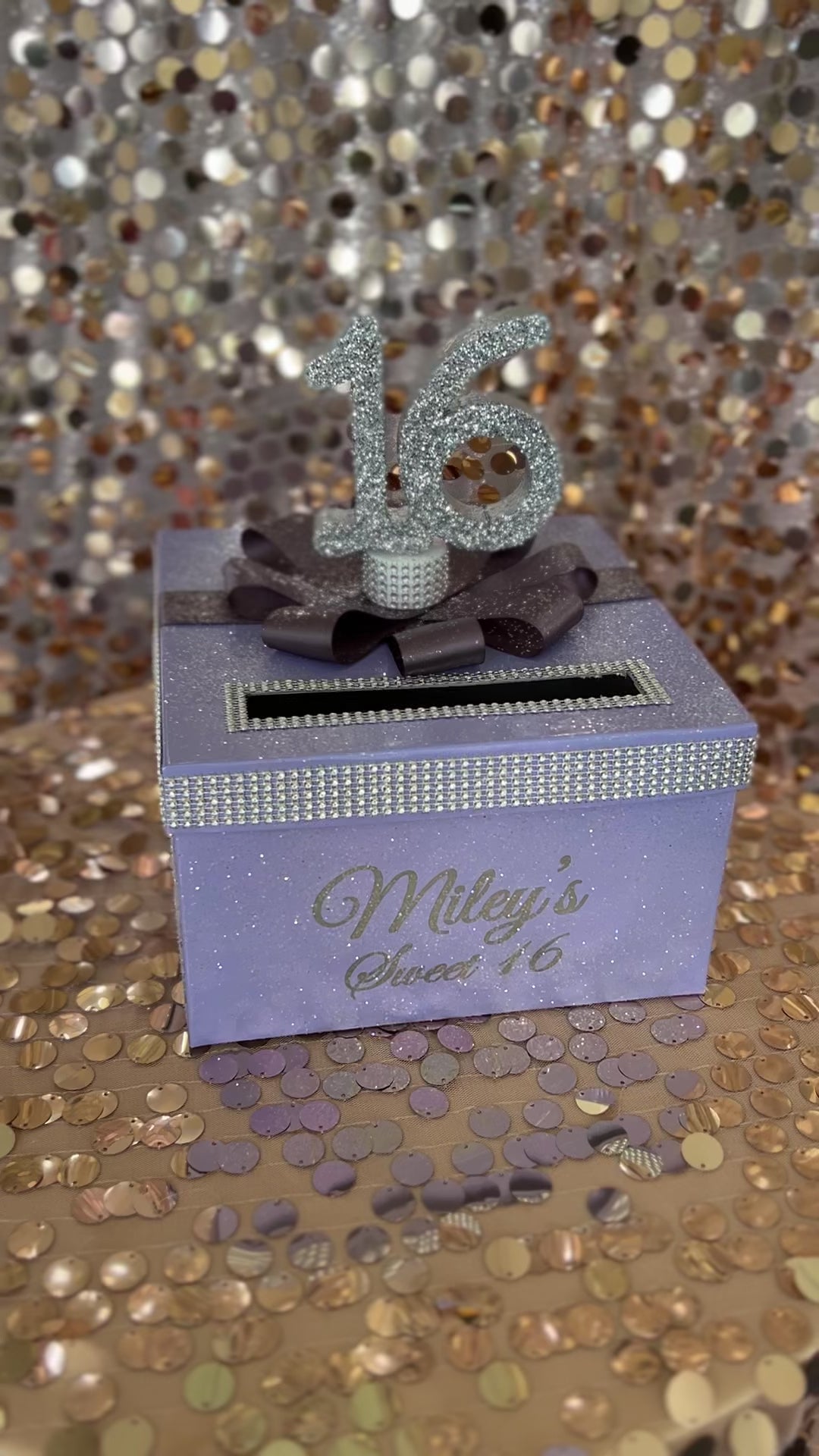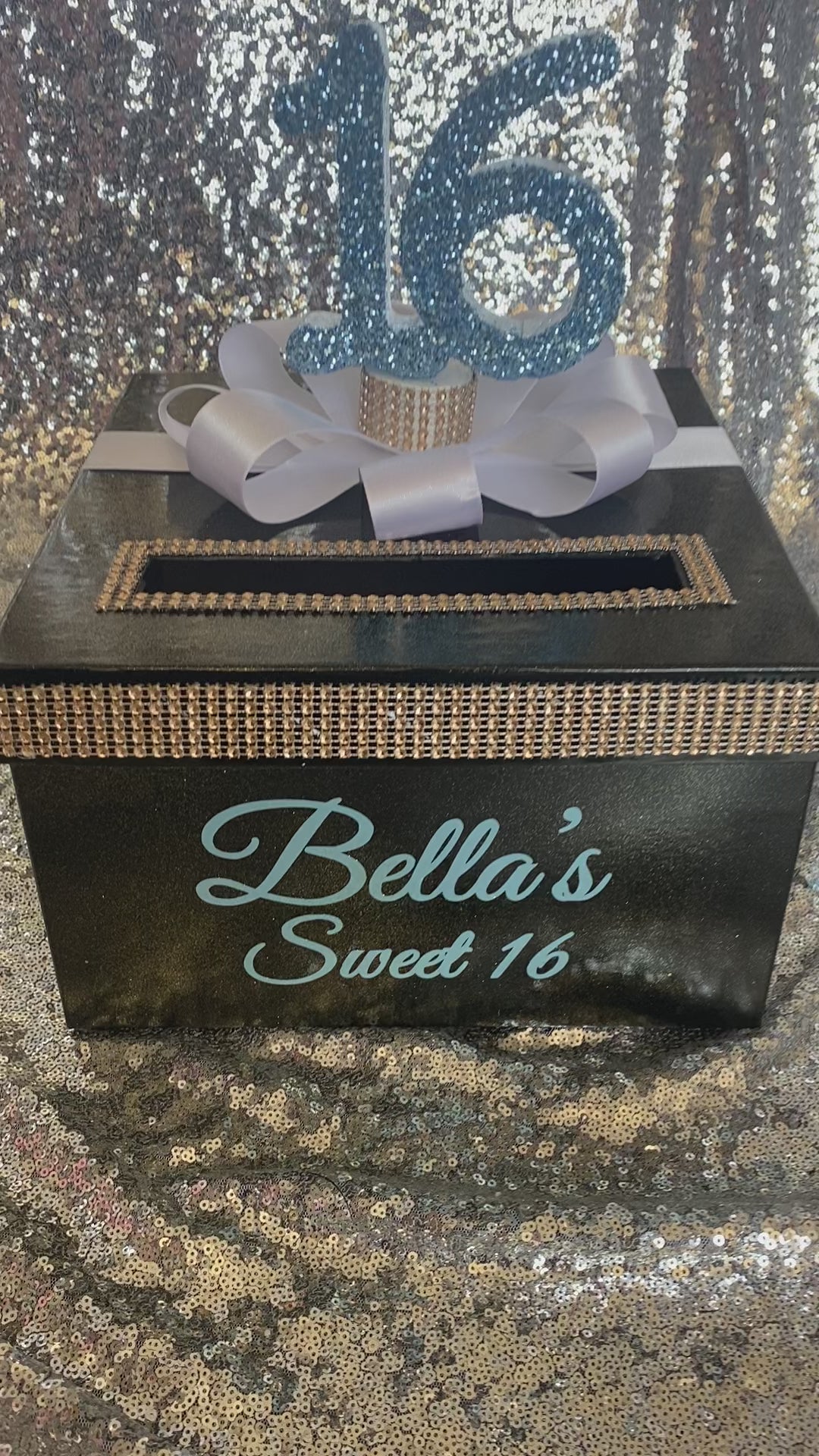 Large bow with rhinestone on top topped with a glittered 16 (or any number!). Mailbox slot with rhinestones. This doubles as a centerpieces on the VIP table!