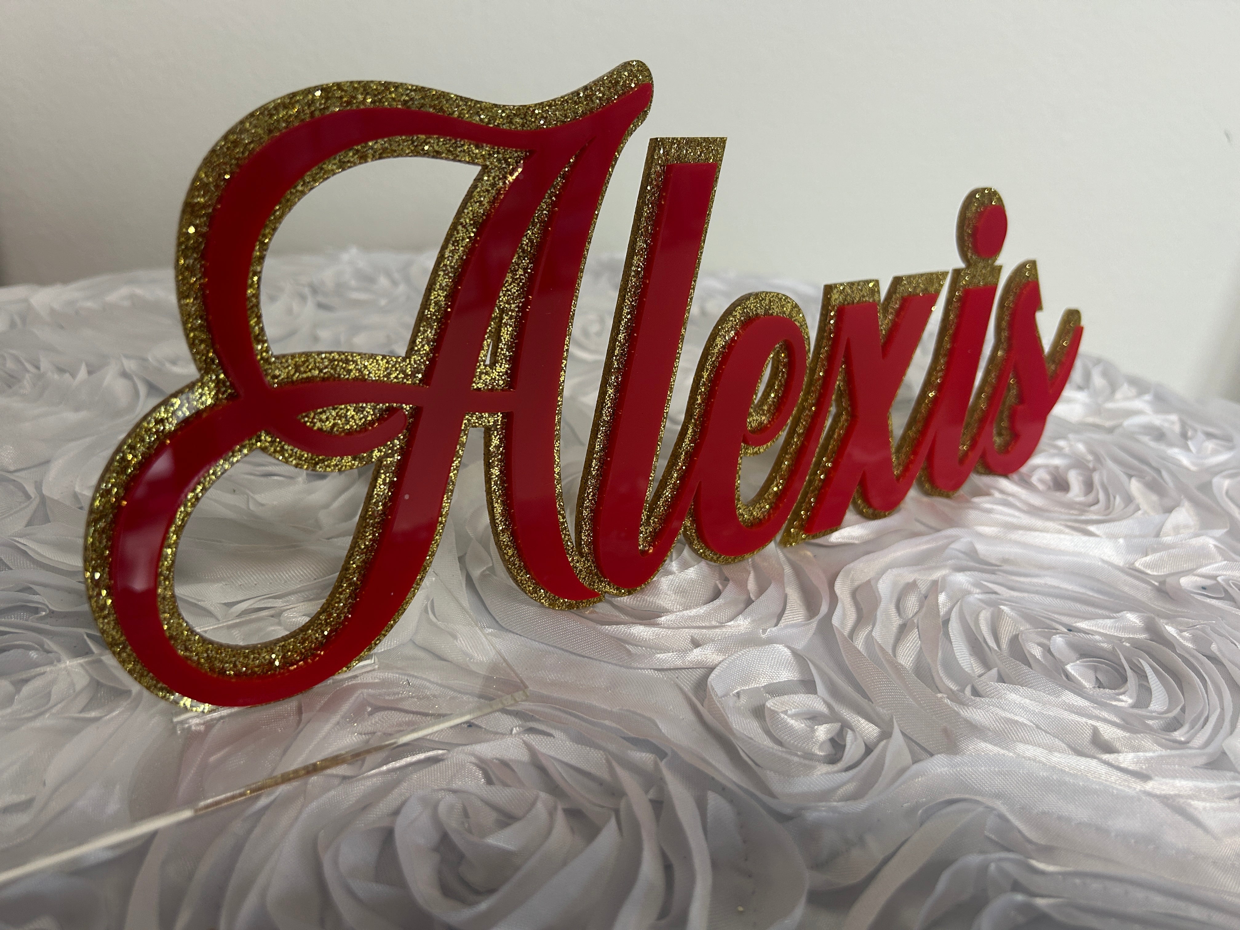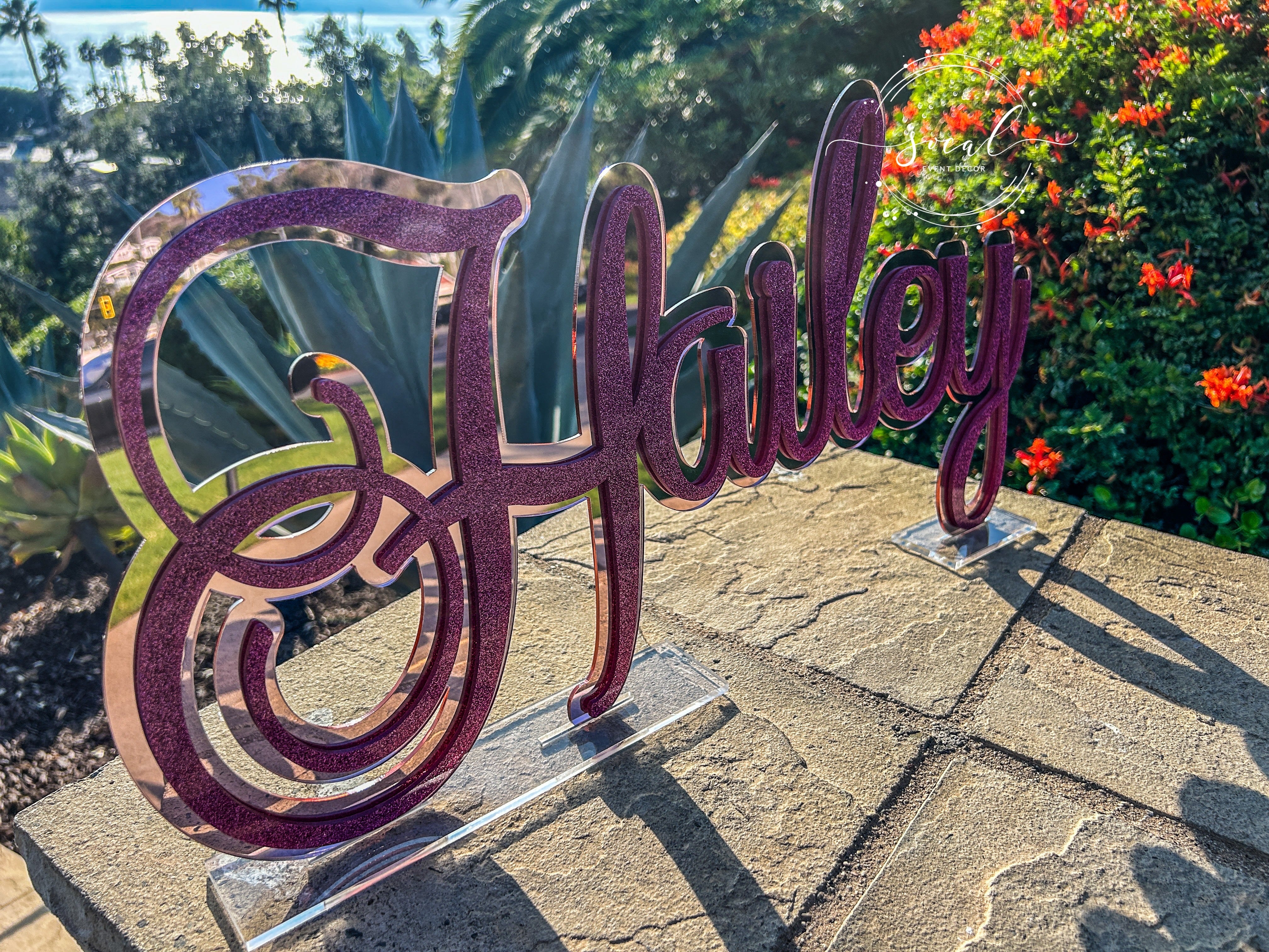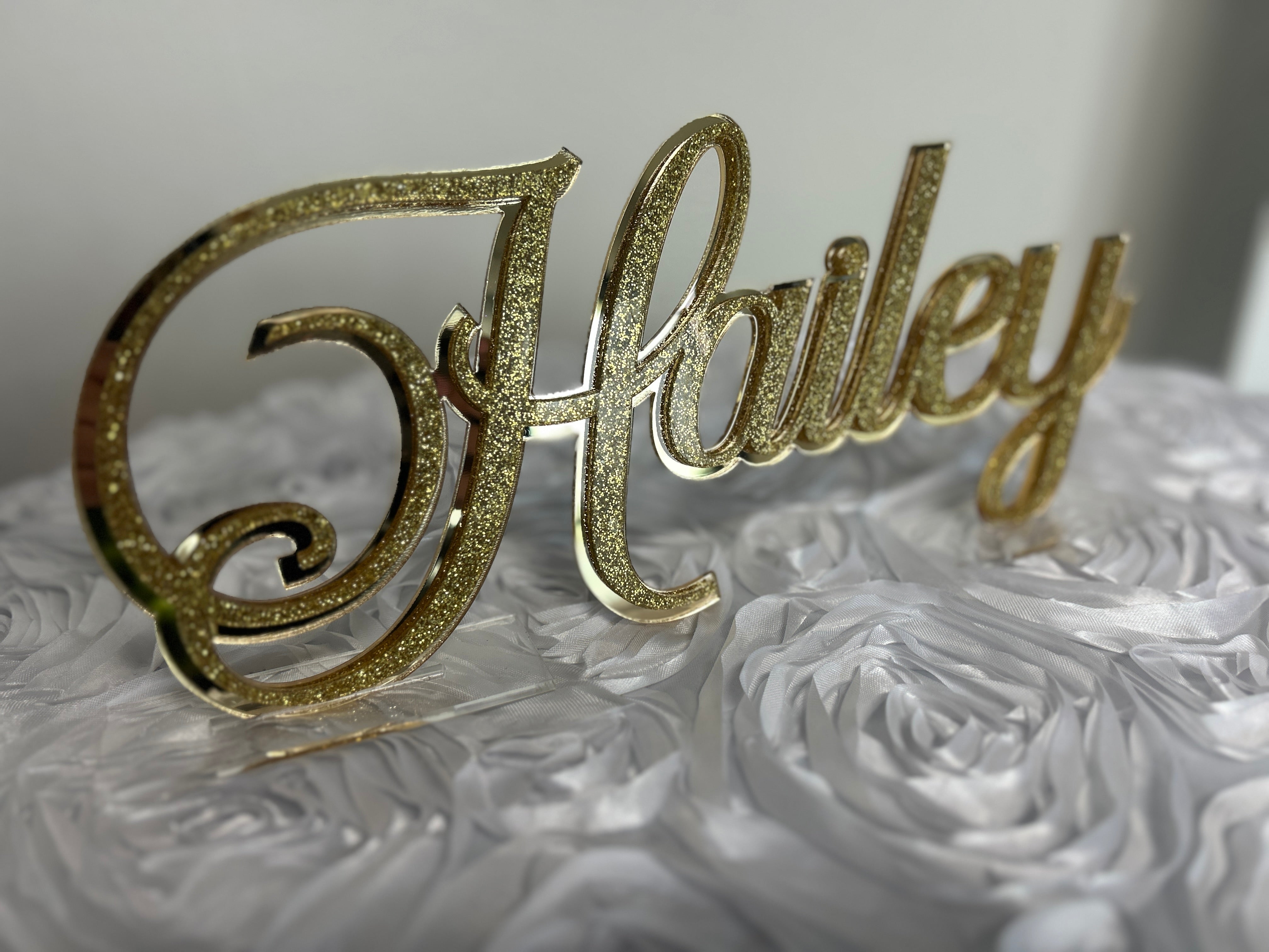 So many colors to choose from including beautiful mirror finish, sparkly glitter and vibrant standard colors. Also included are clear stands that you will insert the name into so it can freestand. This can also easily be hung on a wall after the party! The name is available in three sizes 12" Long (Hailey gold, Alexis & Guiliana, 17" long (Arianna) and 23" long (Hailey pink) and 35" long.