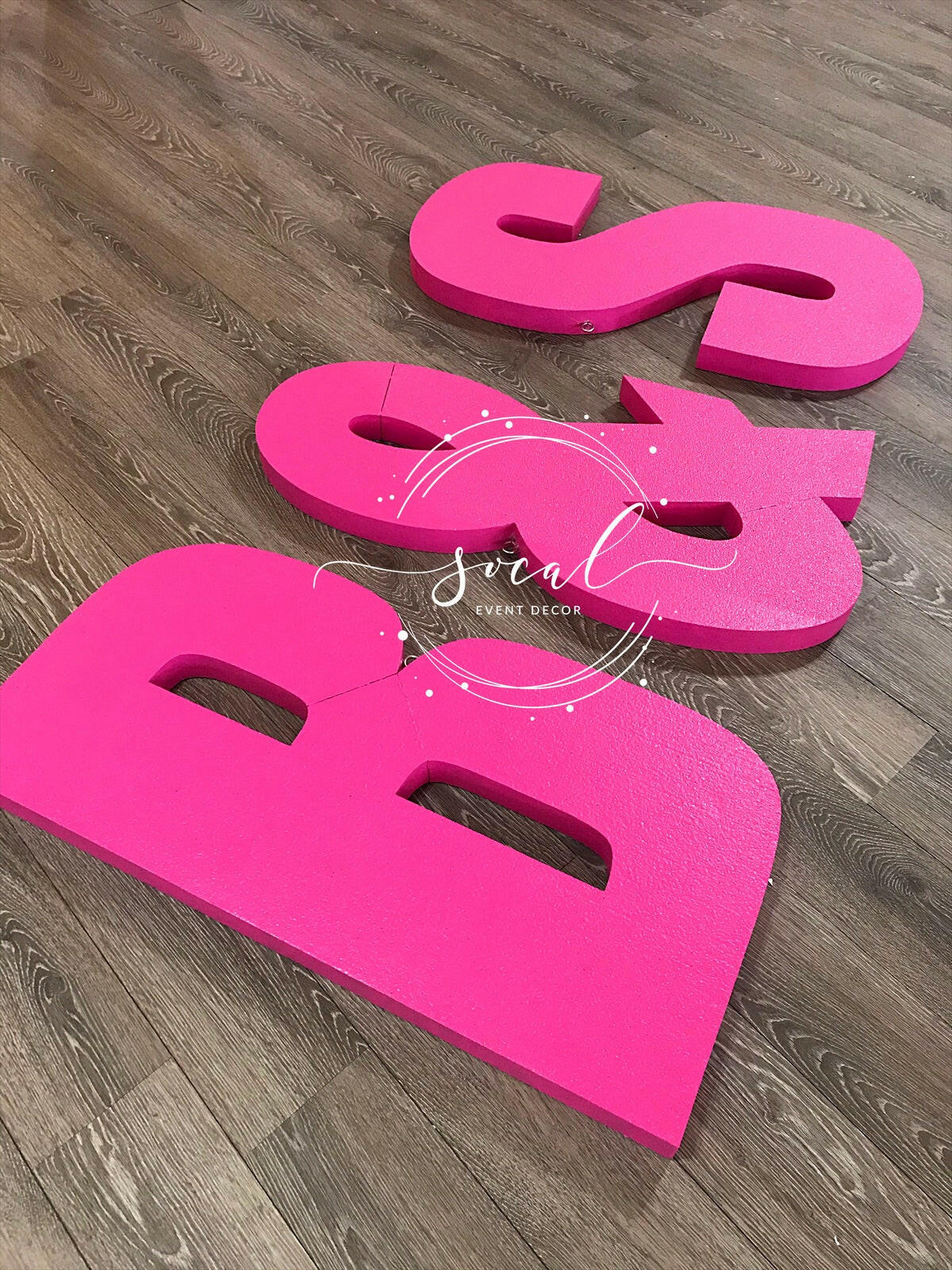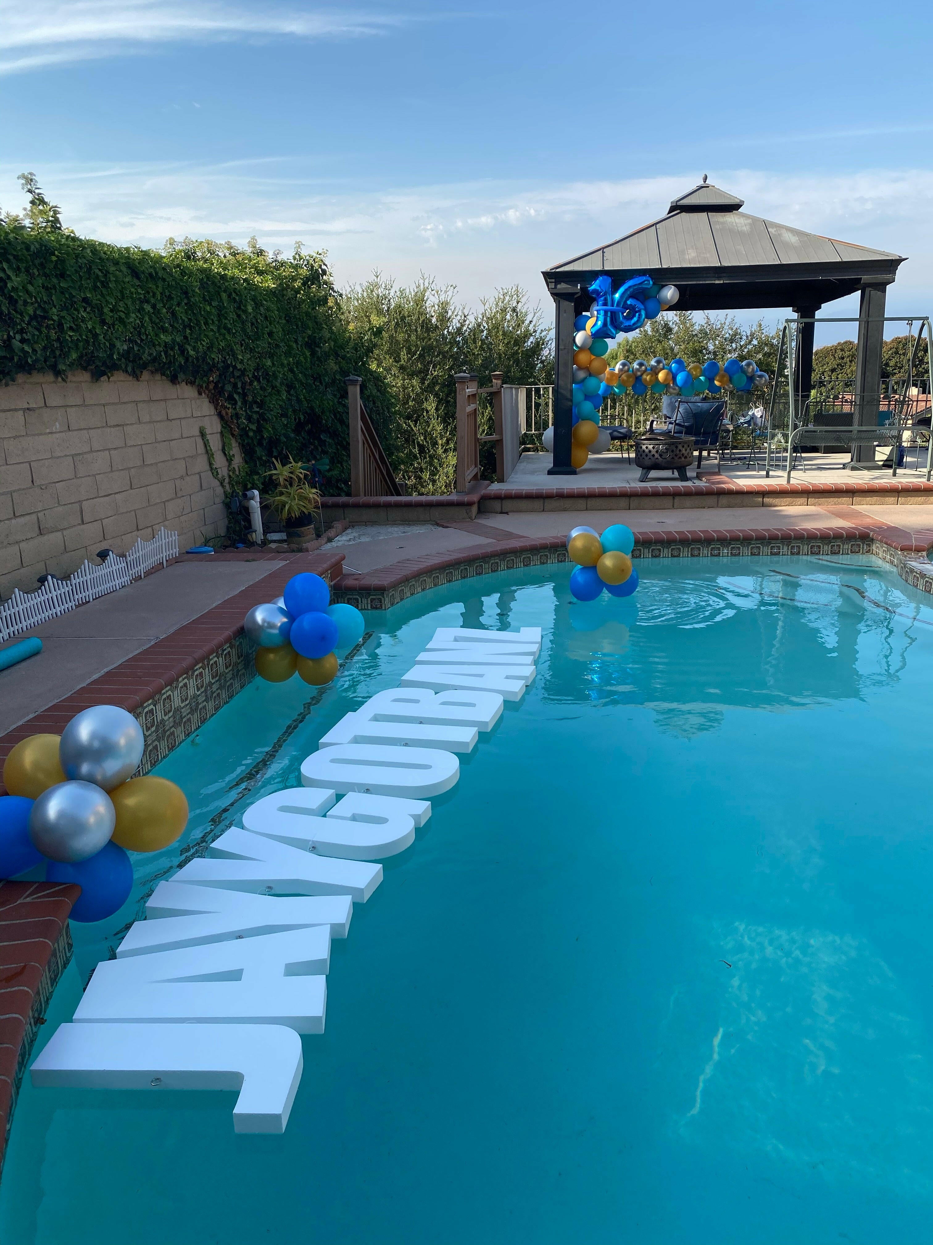 This is custom item is a statement for your outdoor event or pool party! Yes it floats in the pool!! This prop is huge! Each letter is approximately 24" H by 13” wide and they are 2" thick. Options for Painted top and side in your choice of color!