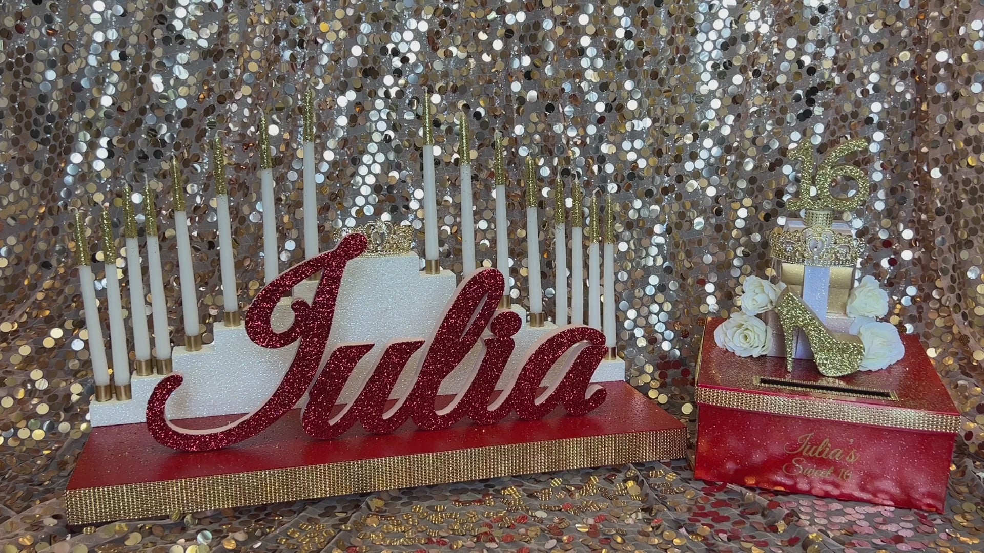 This listing also includes the gorgeous 14” card box complete with triple stack box. glittered 16. beautiful tiara. high heel and roses!