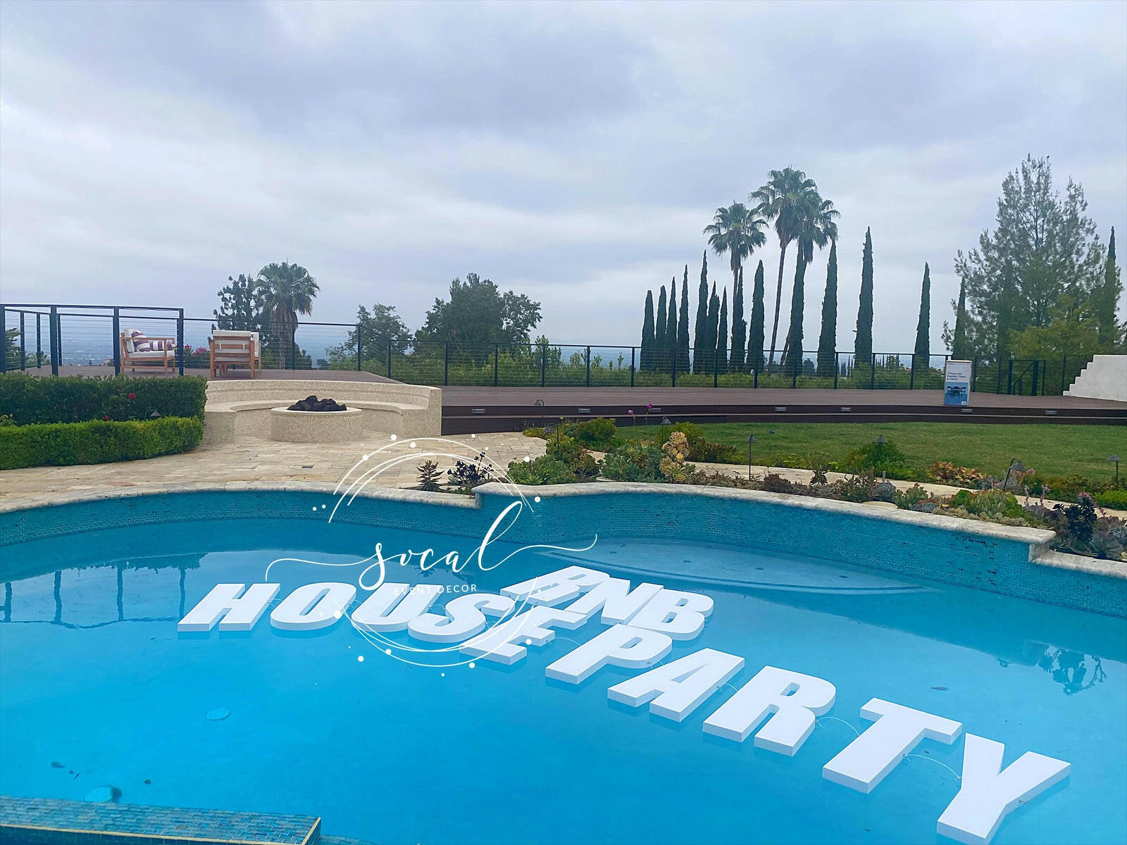 This is custom item is a statement for your outdoor event or pool party! Yes it floats in the pool!! This prop is huge! Each letter is approximately 36" H by 17” wide and they are 2" thick. Options for Painted top and side in your choice of color!