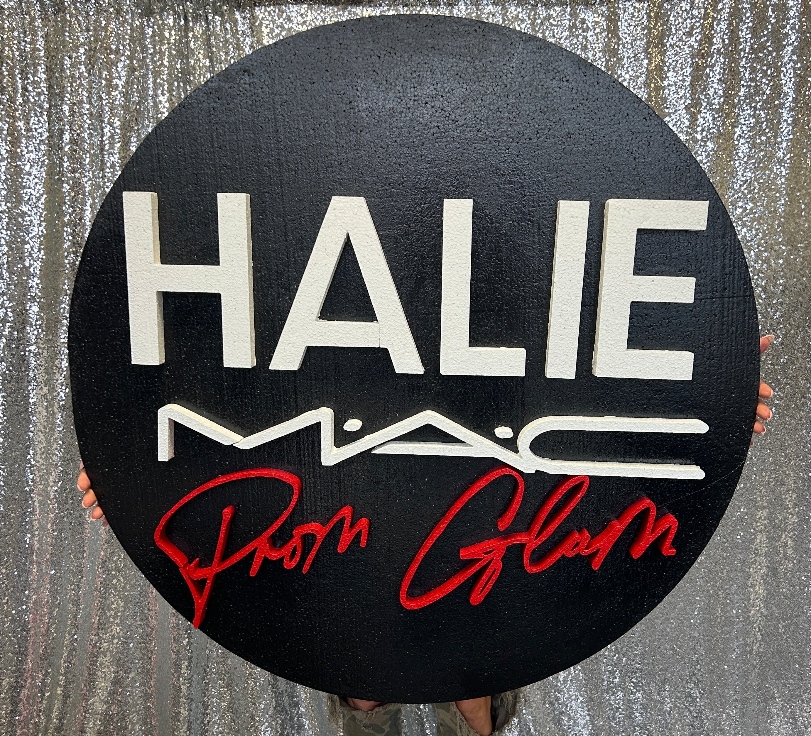 Archway shape (flat) with 4 large shelves paint to match. Logo can be in painted wood or acrylic.