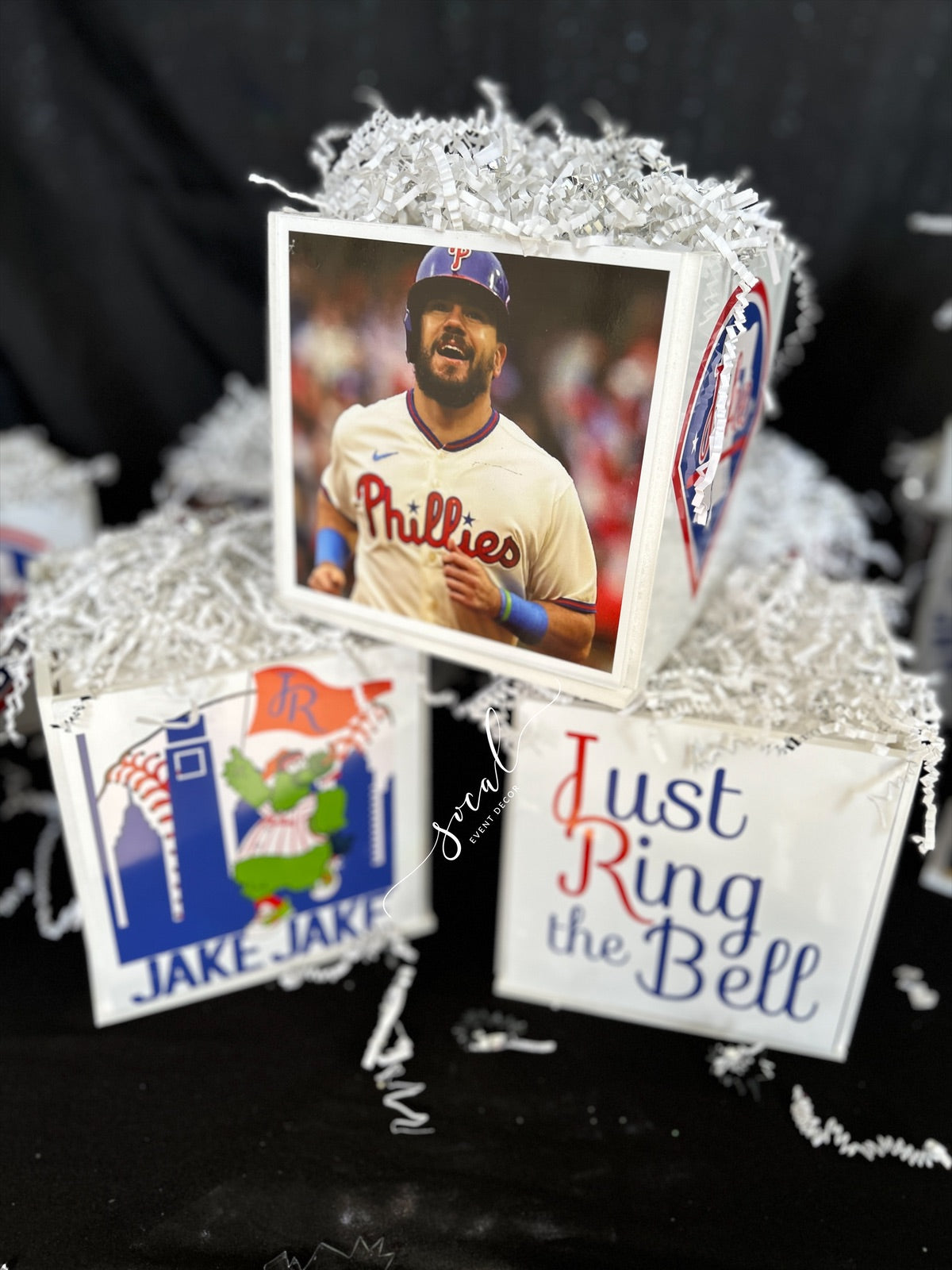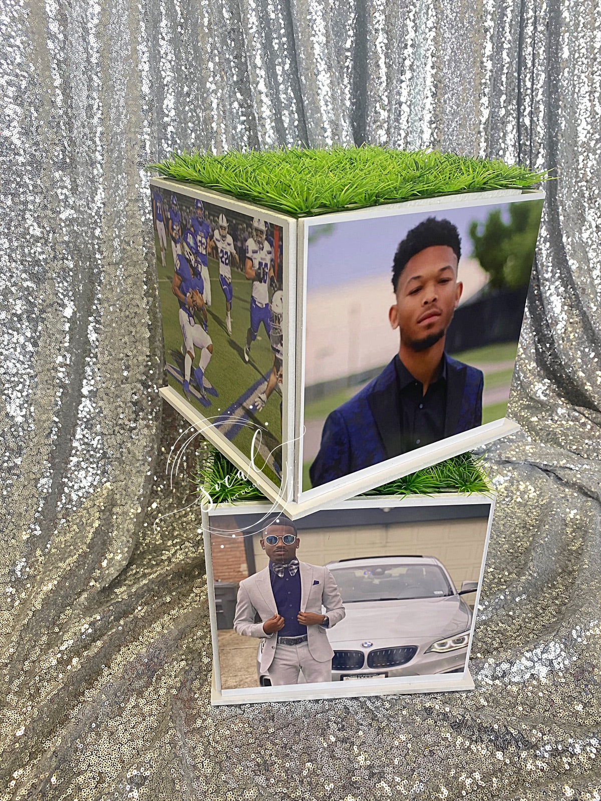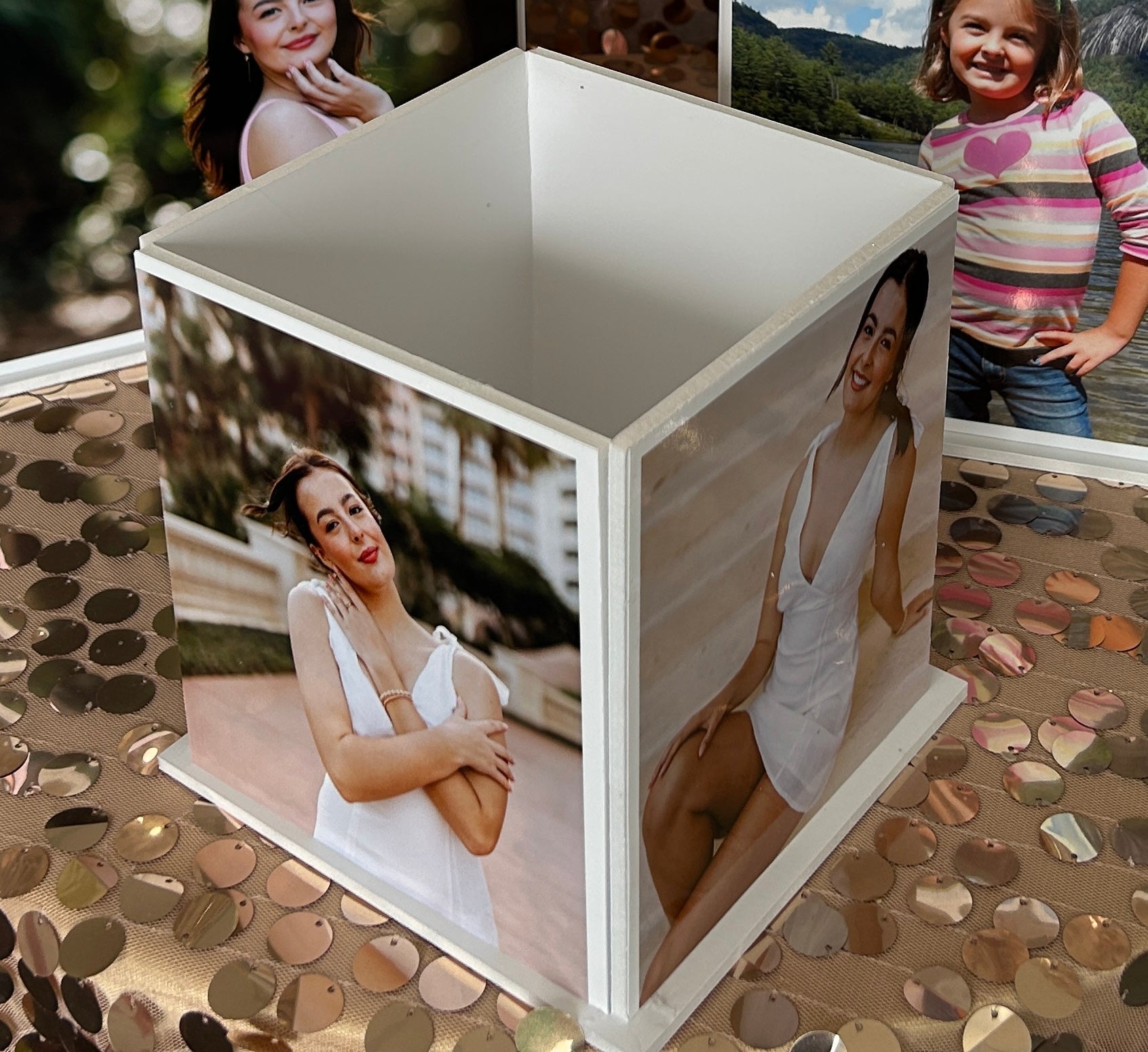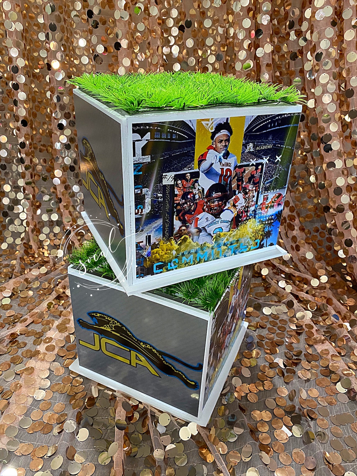 USA Made! Please support Local! Fun four-way designed box. A different custom graphic on each side! The dimensions of this box are 10 x 10 and 6"x6". Ordering ONE is for ONE centerpiece.