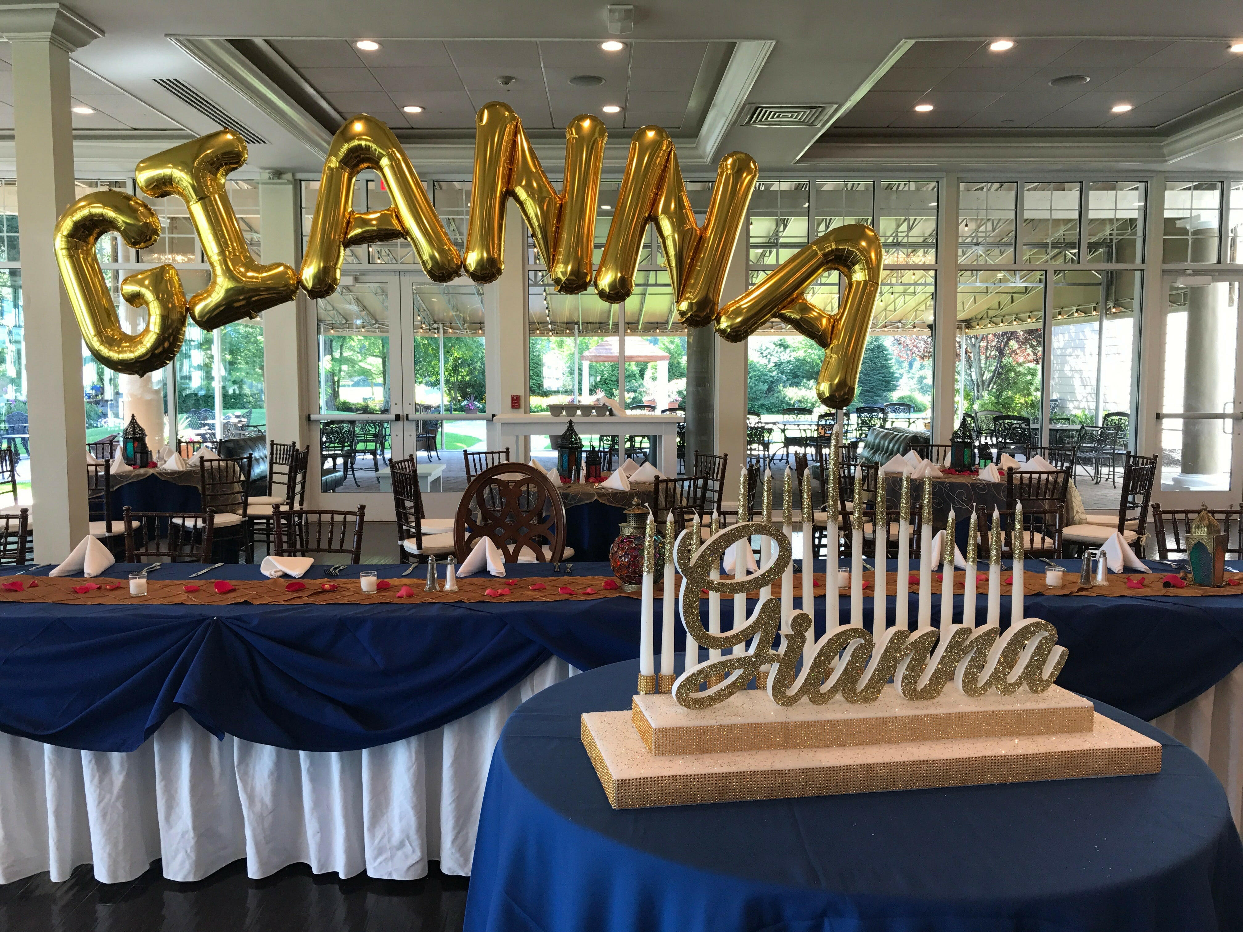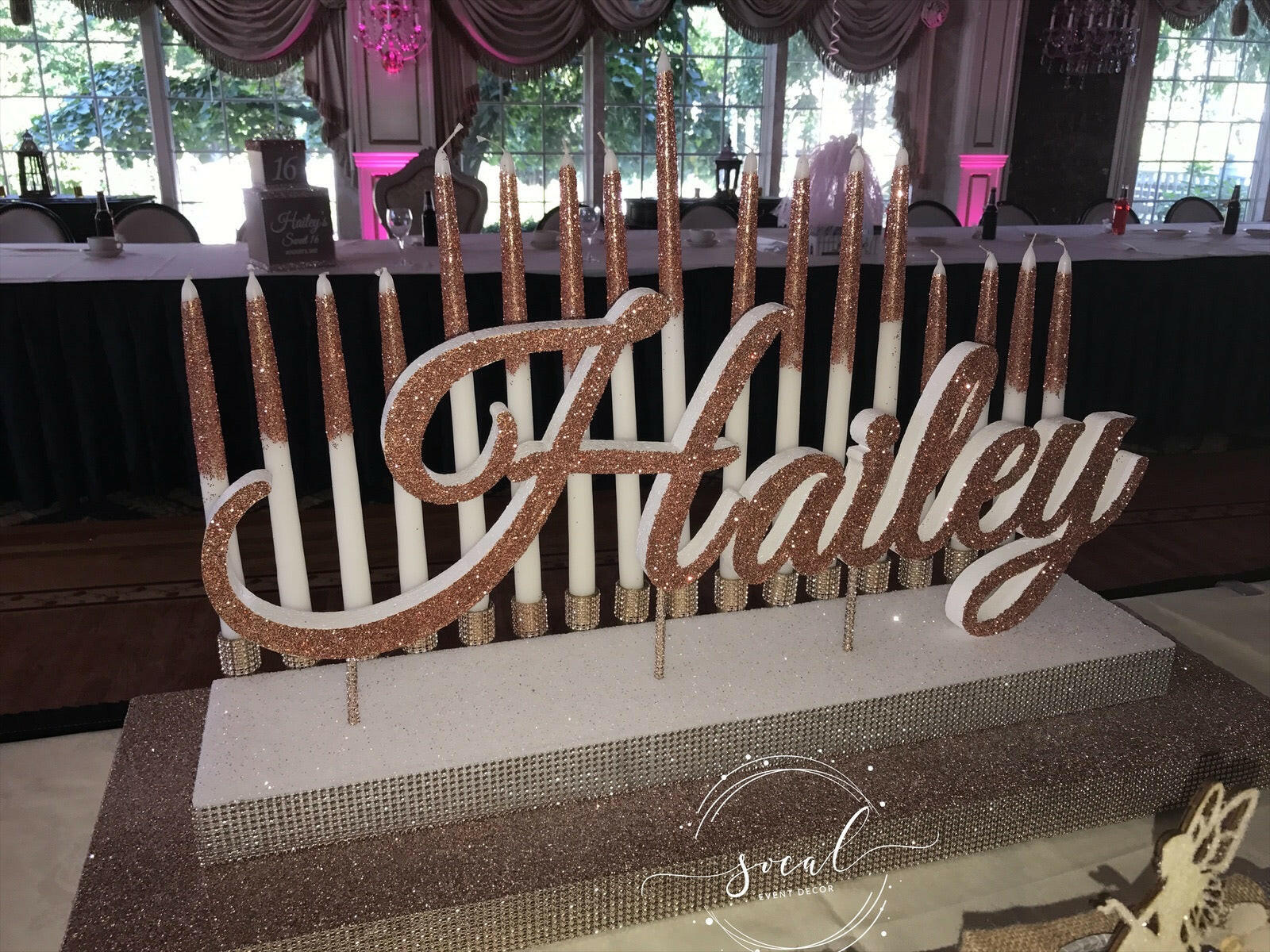 The bottom tier base is 12” width by 36" long, depending on your name, the letters range between 25-30" long. We include "river of diamond" border in gold or silver on all centerpieces unless you state otherwise.